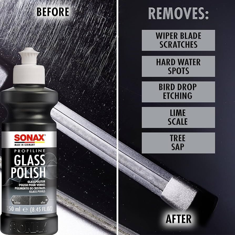 Dung dịch đánh bóng xóa xước bề mặt kính Sonax ProfiLine Glass polish (dùng máy) dùng để loại bỏ các vết trầy xước nhẹ, những điểm mờ và bị xói mòn từ kính chắn gió xe và cửa sổ bên được làm từ kính thực.