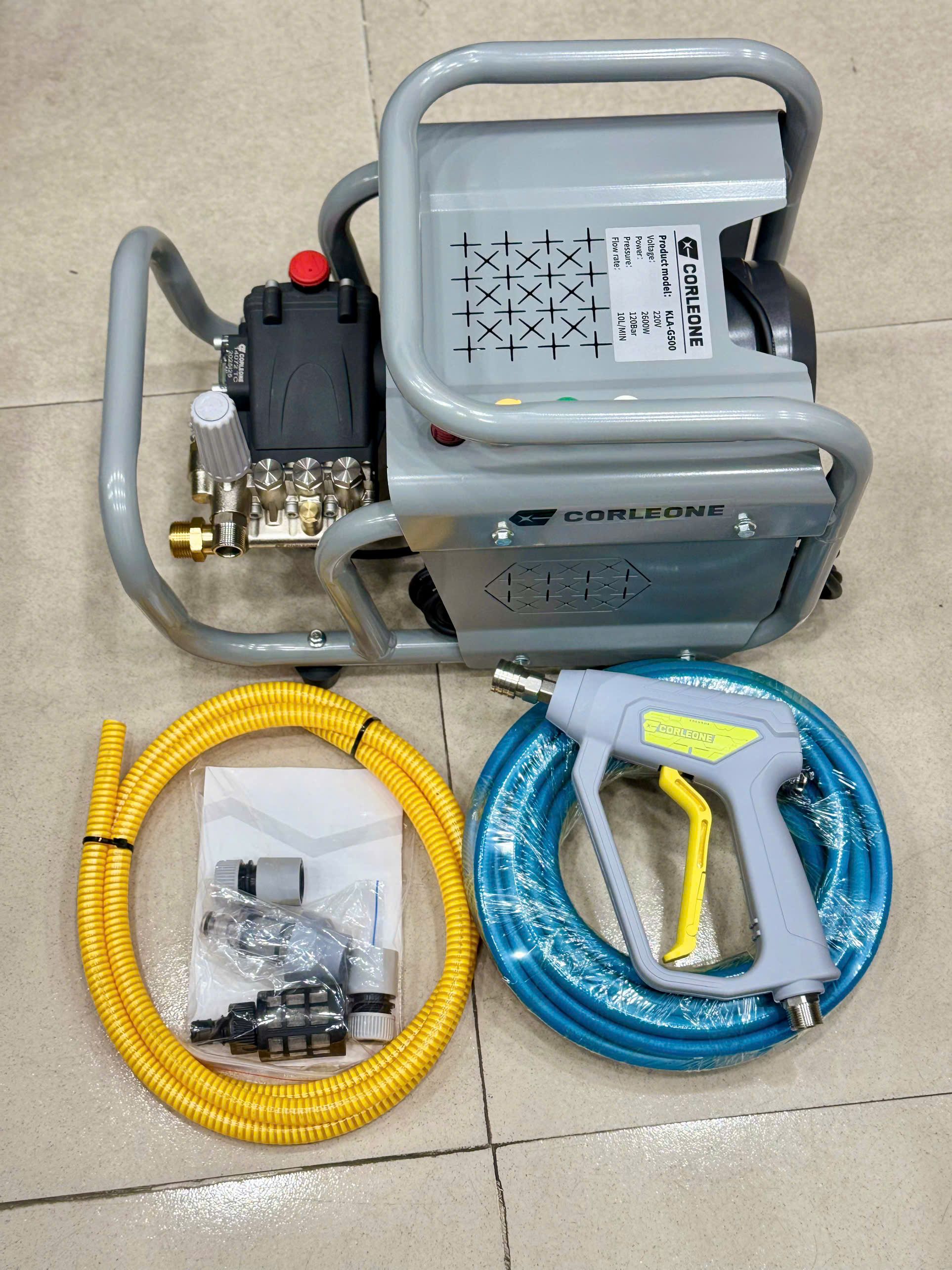 Máy Rửa Xe Gia Đình Áp Lực Corleone KLA G500 120Bar Hàng Nội Địa Trung động cơ cảm ứng từ, đầu bơm trục khuỷ ty sứ áp lực cao gia đình rửa sân vườn, rong rêu, chỉnh áp rửa máy lạnh, may rua xe áp lực cao chống nước, máy xịt rửa xe áp lực cao ,dây cao áp dài 10m, dễ dàng sử dụng.