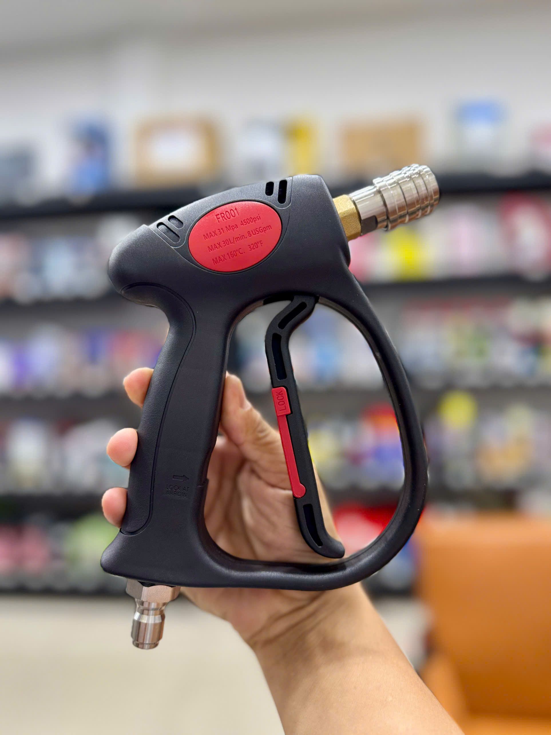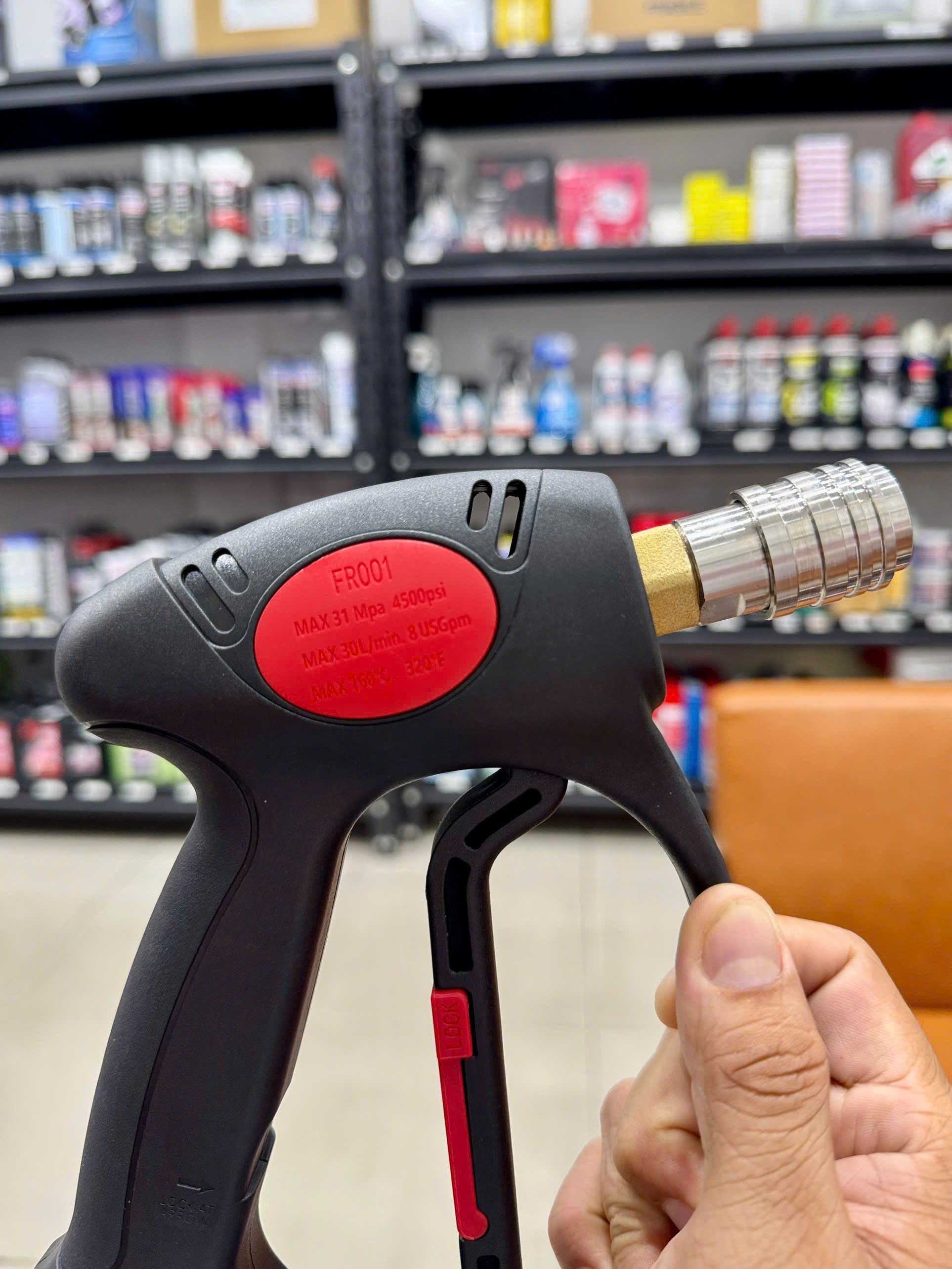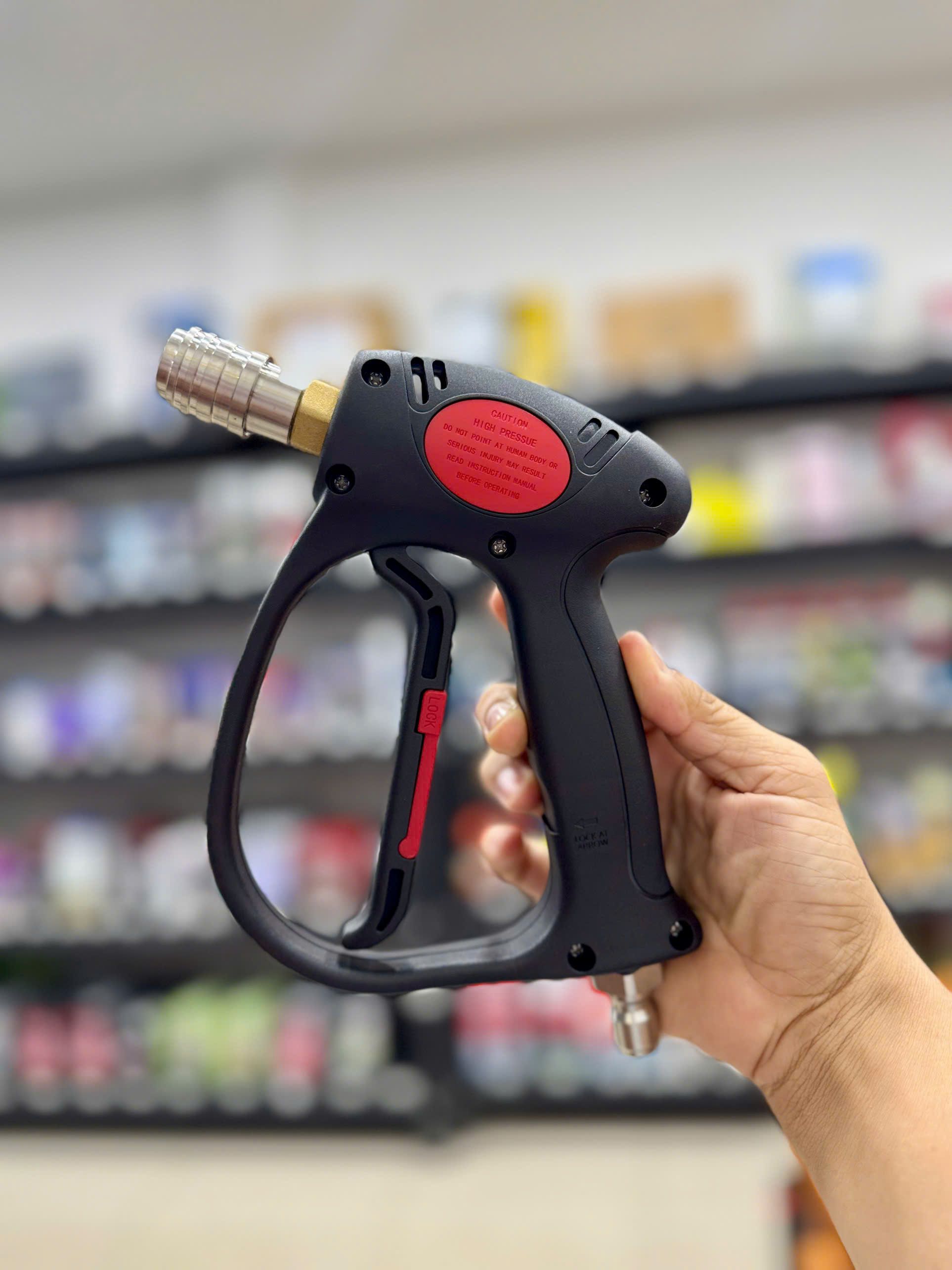 - Khớp nối của súng xịt xe được làm bằng đồng thau dùng để kết hợp với dây rửa xe của máy xịt rửa áp lực cao.